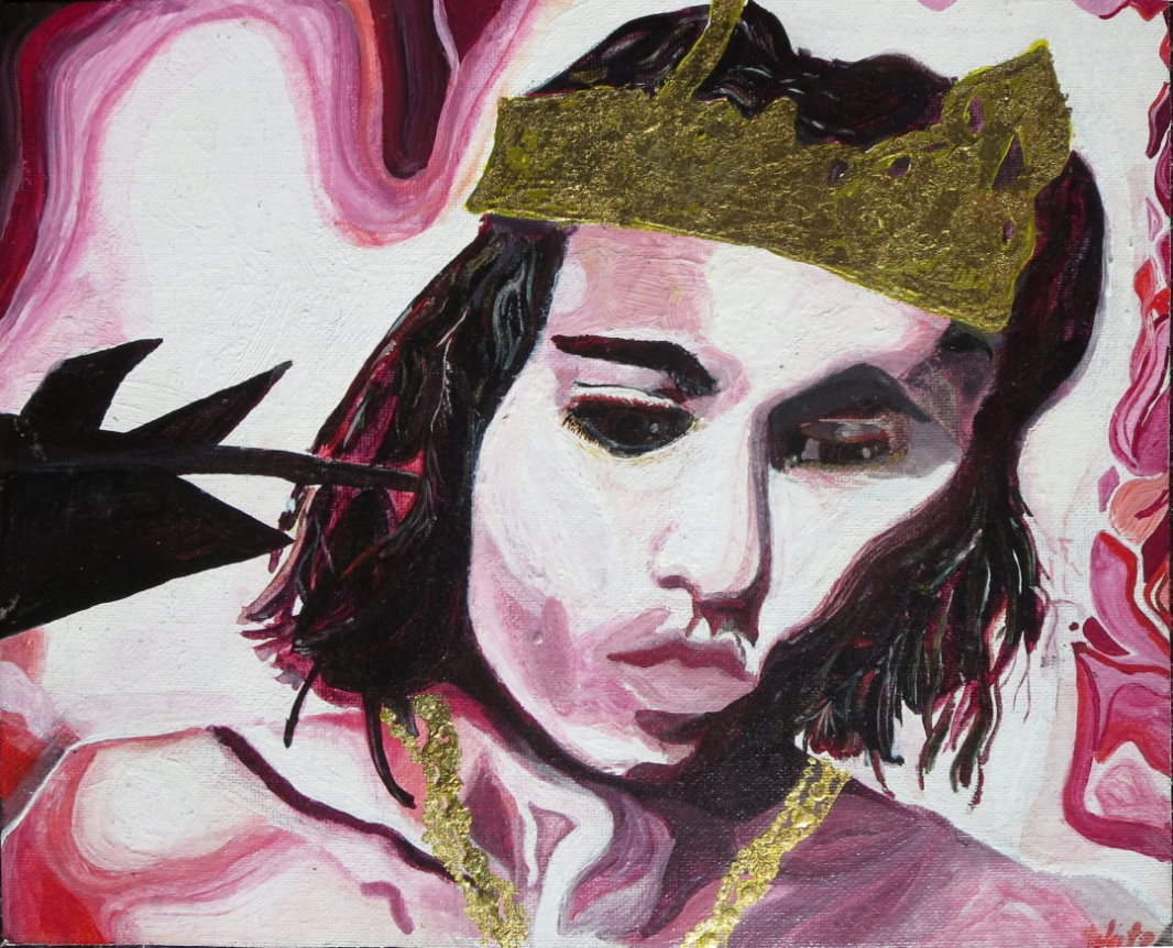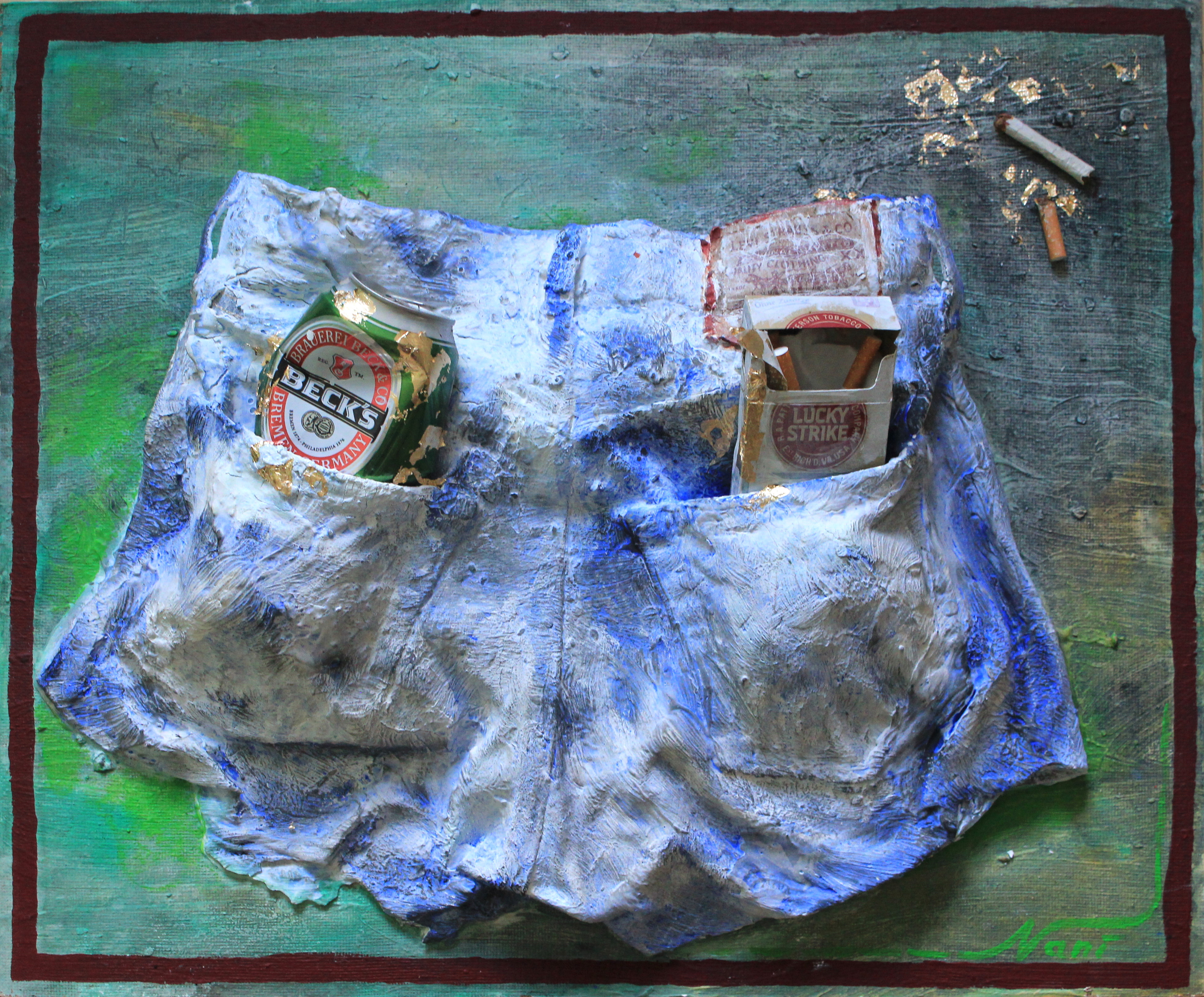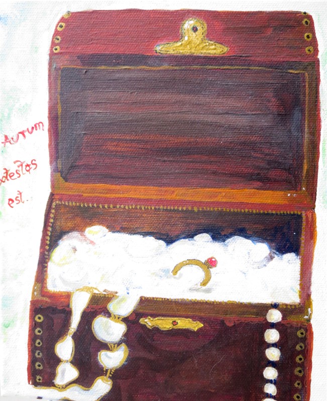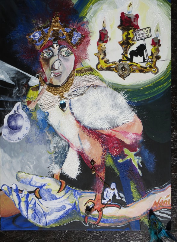 Weiter nutze ich Materialien wie Schlagmetall, Blattgold, Stoffe und Schmuck sowie Alltagsgegenstände.