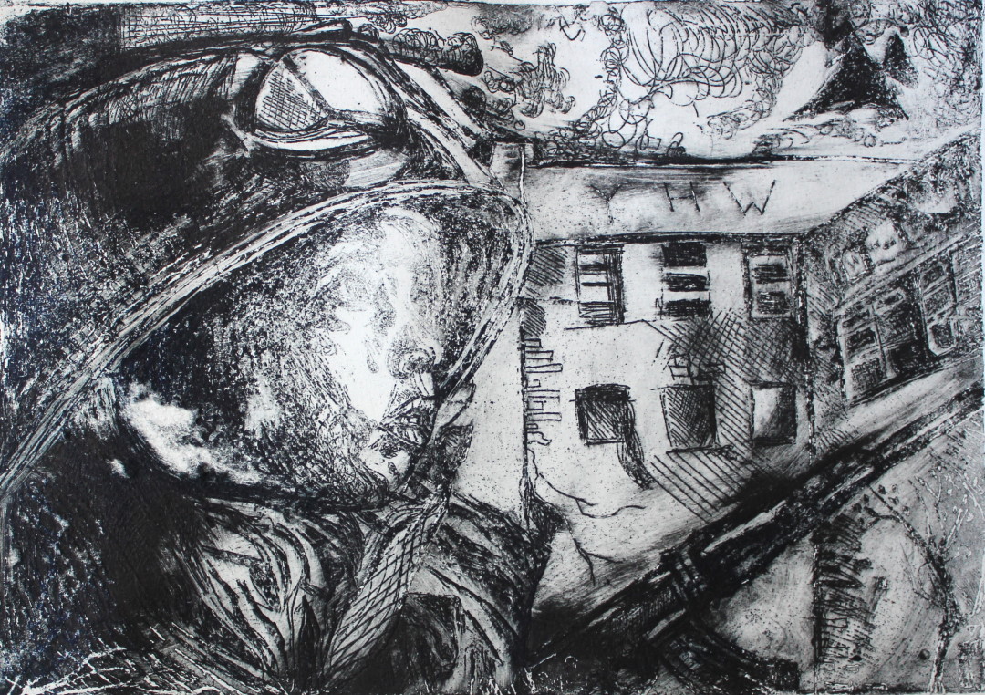 Helm auf, Hab-Acht-Stellung, funktioniere! Und du kämpfst, blutest, lässt deine Freunde liegen, bist ein Rädchen im Getriebe. Der Himmel erzählt dir Geschichten von vergangenen Tagen des Glücks. Eine Bombe schlägt ein, Mensch bekriegt Mensch. Was sind wir nur für Kinder des Irrsinns.
